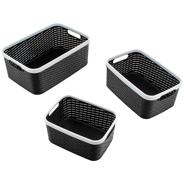 Organize your home or office workspace with this three-pack of Nantucket weave bins. The sophisticated woven design will allow you to sort your clutter while seamlessly blending in with your décor. You can use the bins for craft supplies, paperwork, pantry or laundry items, bedrooms, and more.