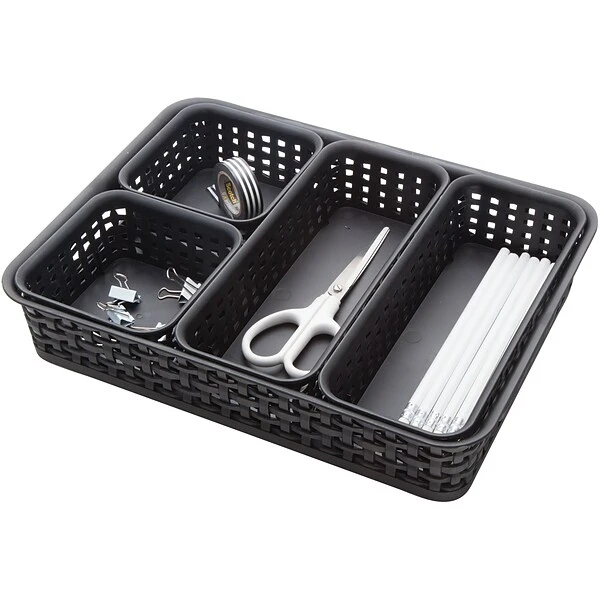 Sturdy bins with an attractive, functional design are perfect for organizing your space. Bins come in multiple sizes to accommodate items of various items. Weave design offers a fashionable accent.