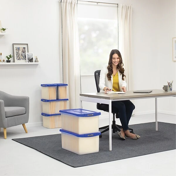The Bankers Box plastic storage container with lid provides organized and secure storage and transport of 20″ of letter files. Durable plastic storage bin construction with reinforced corners for added strength. Modular design offers easy stackability while built-in hanging rails keep legal-size files organized and accessible. Features comfortable handles for easy lifting and locking lid for secure transport.