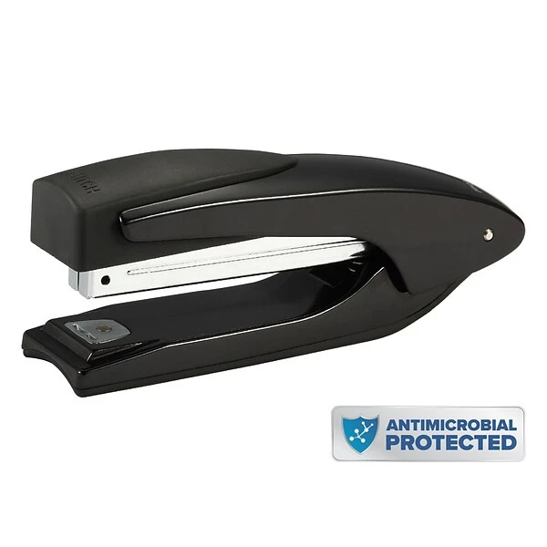 Fasten paperwork together securely with this stand-up stapler. The antimicrobial protection helps prevent the growth of germs on product, while the die-cast metal construction produces a high-quality, lasting tool. This Bostitch black executive stapler can lay flat or stand up for versatile stapling use and a more modern appearance, and a clear window helps ensure you never run out of staples in the middle of a task.