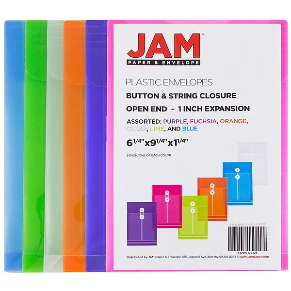JAM Paper & Envelope’s Medium Plastic Button and String Open End Poly Envelopes are designed to hold and carry small – medium sized documents. Made from smooth semi-translucent plastic, these envelopes are water, scratch and tear resistant, constructed to safely secure and protect important documents from the elements. They measure 6.25 x 9.25 inches, fitting documents on their right side up, and include a button & string closure, intended to help fasten and secure papers. The poly string easily wra ps around the plastic button, and is short enough to not get tangled. Their size also makes these envelopes extremely practical; they easily fit in filing drawers, desk organizers, shelves, or in bags and briefcases if you need them while on the go. Gre at to use for organizing smaller documents like checks, deposit slips, receipts, currency, photos, coupons,and similar sized items . This assorted pack includes some of our most popular colors: Clear, Blue, Green, Purple, Orange, and Pink.