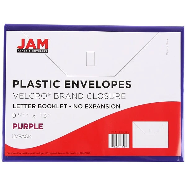 This 12 Pack of JAM Paper® Purple Letter Booklet Sized Envelopes is great for all of your home and office document storage and protection needs. Each envelope is 9.75 x 13 inches in size and is made of flexible, and durable plastic material. Use them to store standard sized documents in desks, cabinets, or glove compartments. Guard documents against bending and tearing as you transport them from place to place. The rectangular, certified Hook & Loop closure of these envelopes keep them reliably closed and can be easily opened. Don’t let your documents become disorganized or blemished. Use these bold purple envelopes to keep them protected!