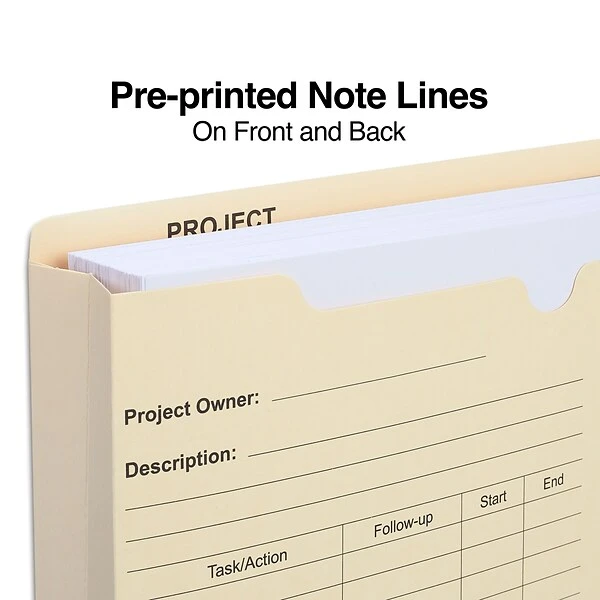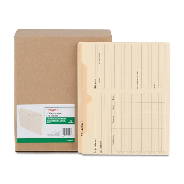 Keep track of to-do items, team progress and upcoming deadlines with this project file jacket. The three-sided closures hold letter-size documents securely inside, while the reinforced tab design withstands everyday handling. The jacket features a preprinted form on the front and back, providing ample space for team notes and updates. This Staples preprinted manila letter-size project file jacket comes in a convenient 50-count box for easy stocking.