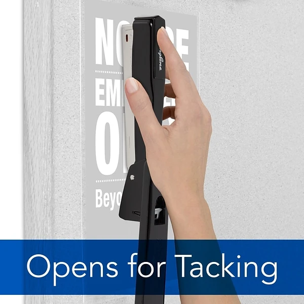 The Commercial Desk Stapler is great for more than just desktop stapling. With a simple push of the release lever on the bottom, the stapler opens 180 degrees to make it easy to tack papers to bulletin boards. You can also rotate the anvil for easy pinning. Pin staples are temporary with legs that point out so they are easy to remove without needing a staple remover.